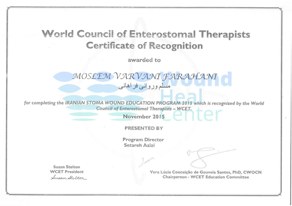 - سرتیفیکیت مراقبت از زخم و استومی از انجمن جهانی زخم استرالیا WCET
