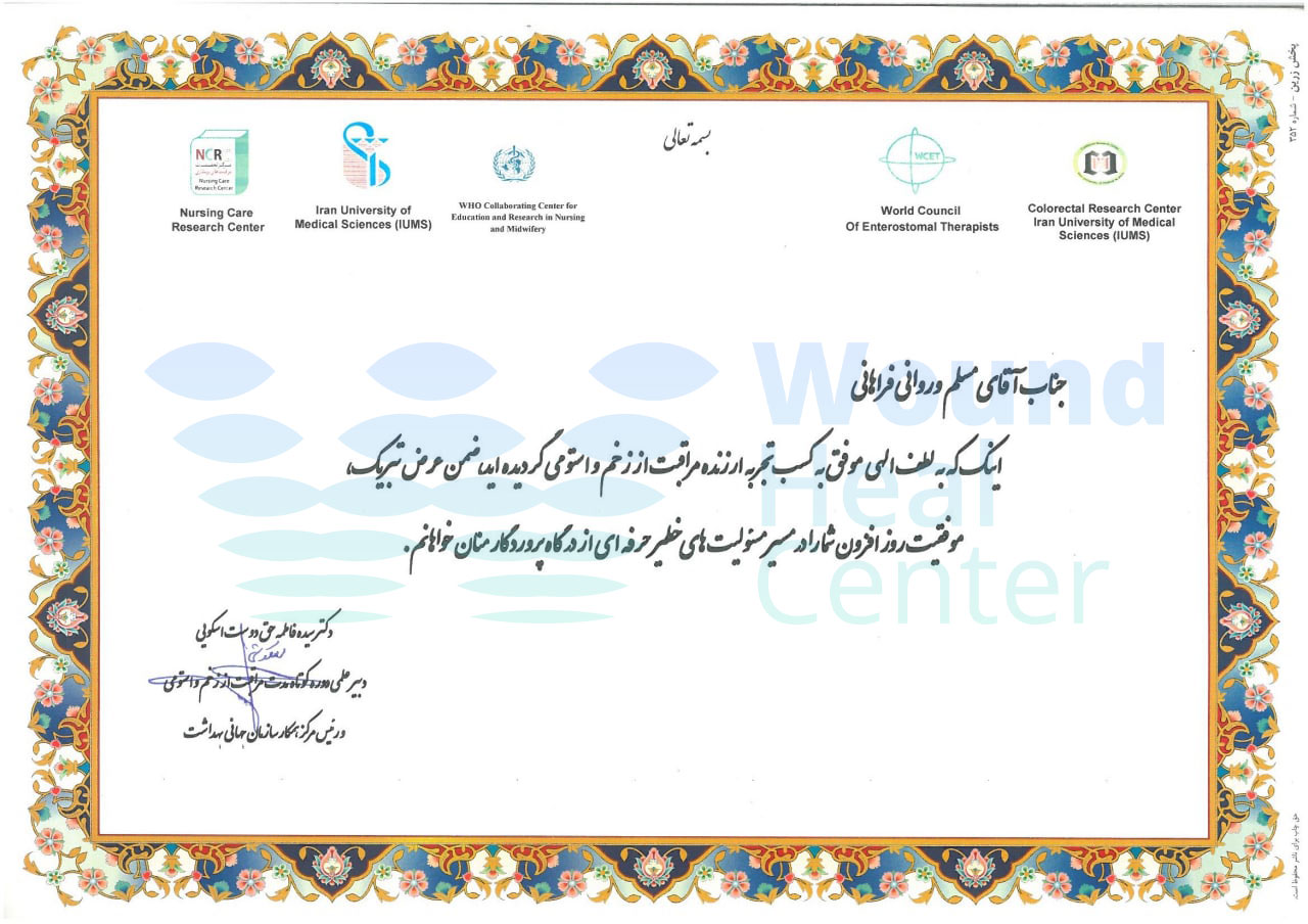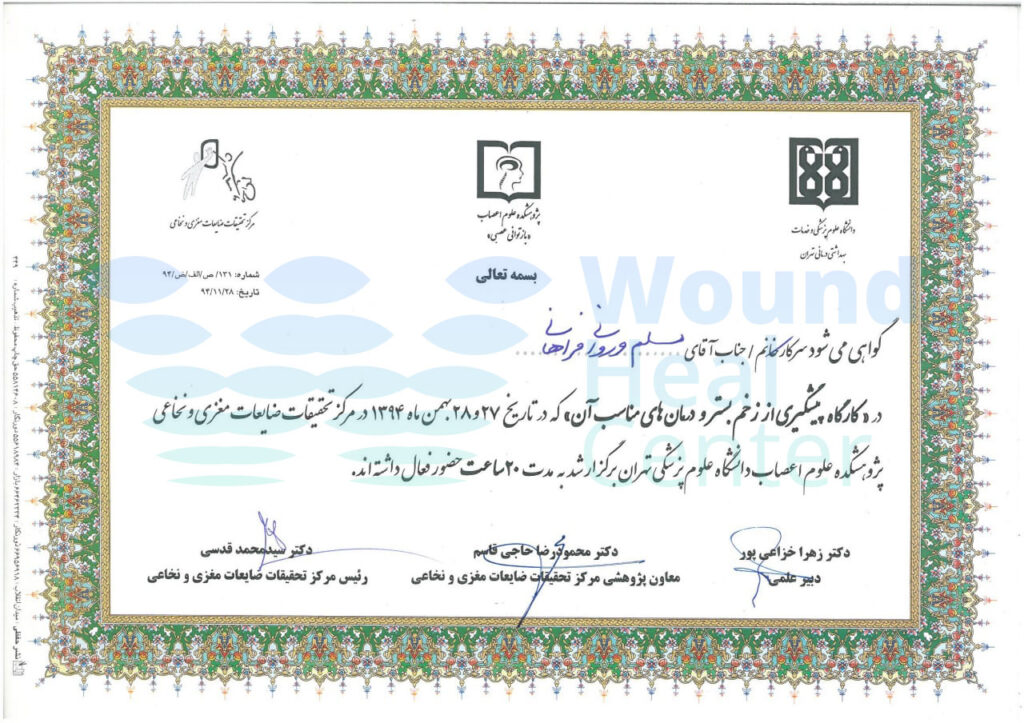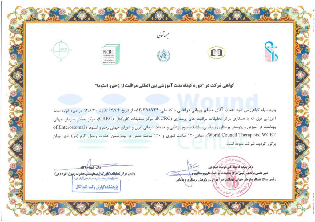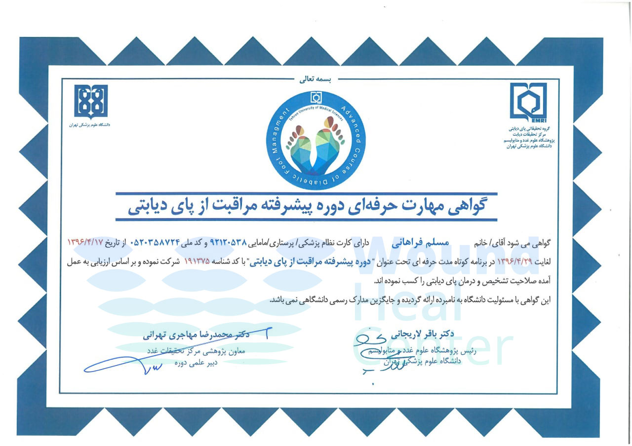 - سرتیفیکیت دوره مراقبت حرفه ای و پیشرفته زخم از دانشگاه ایران