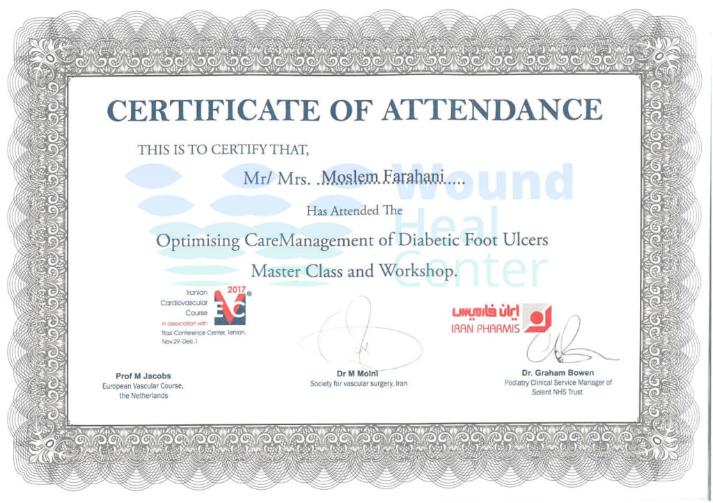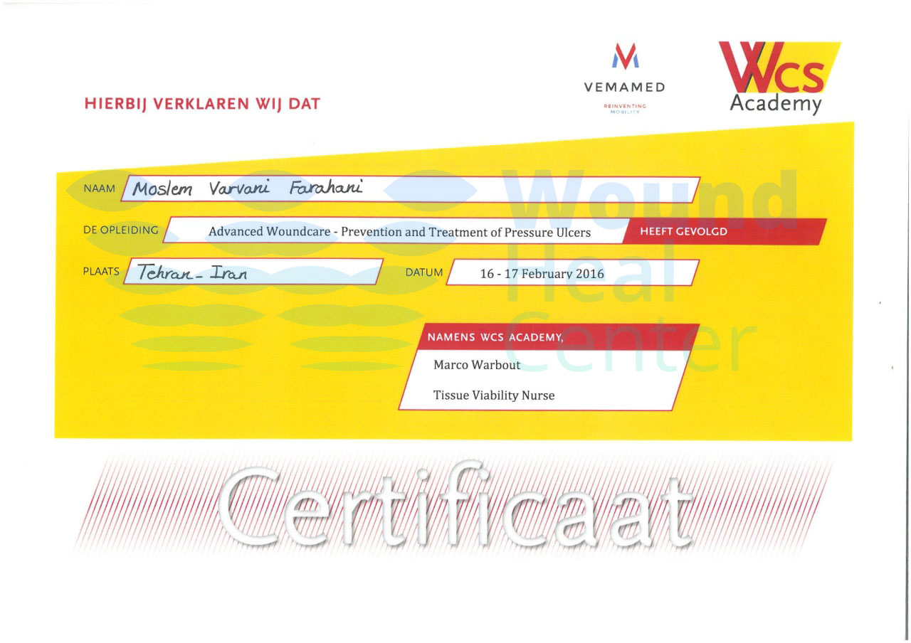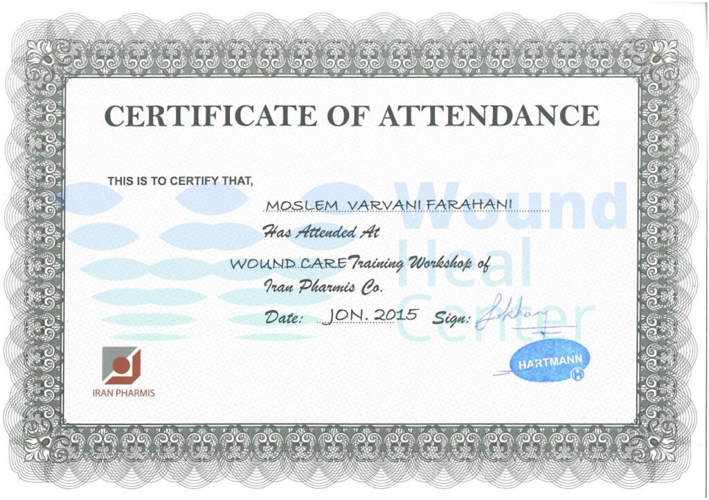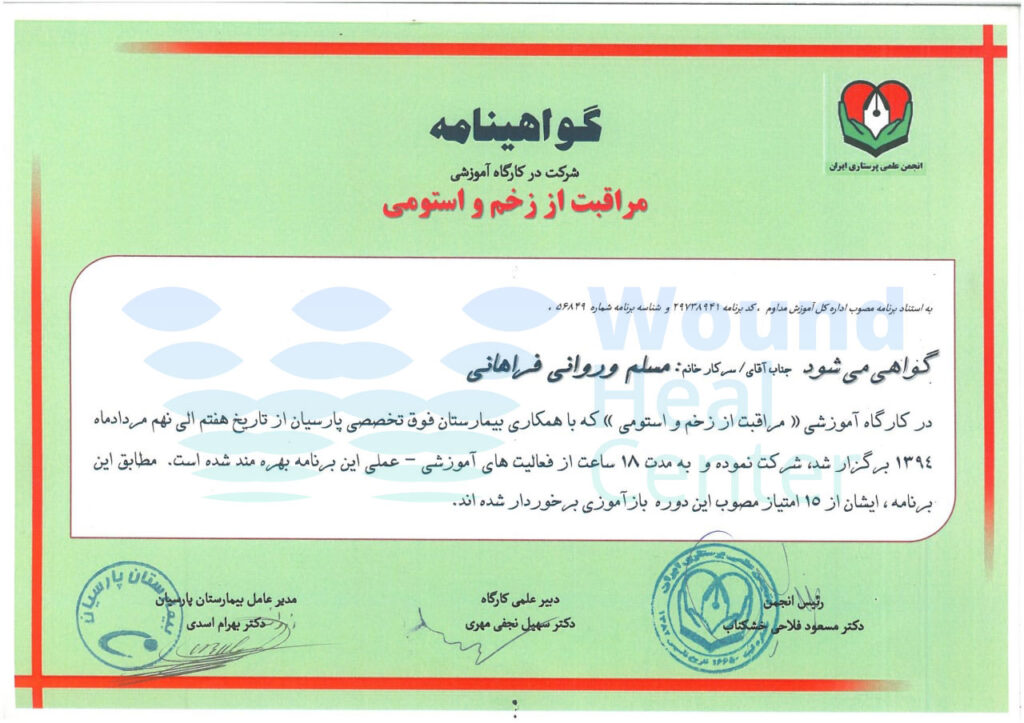- سرتیفیکیت دوره مراقبت حرفه ای و پیشرفته زخم از دانشگاه ایران