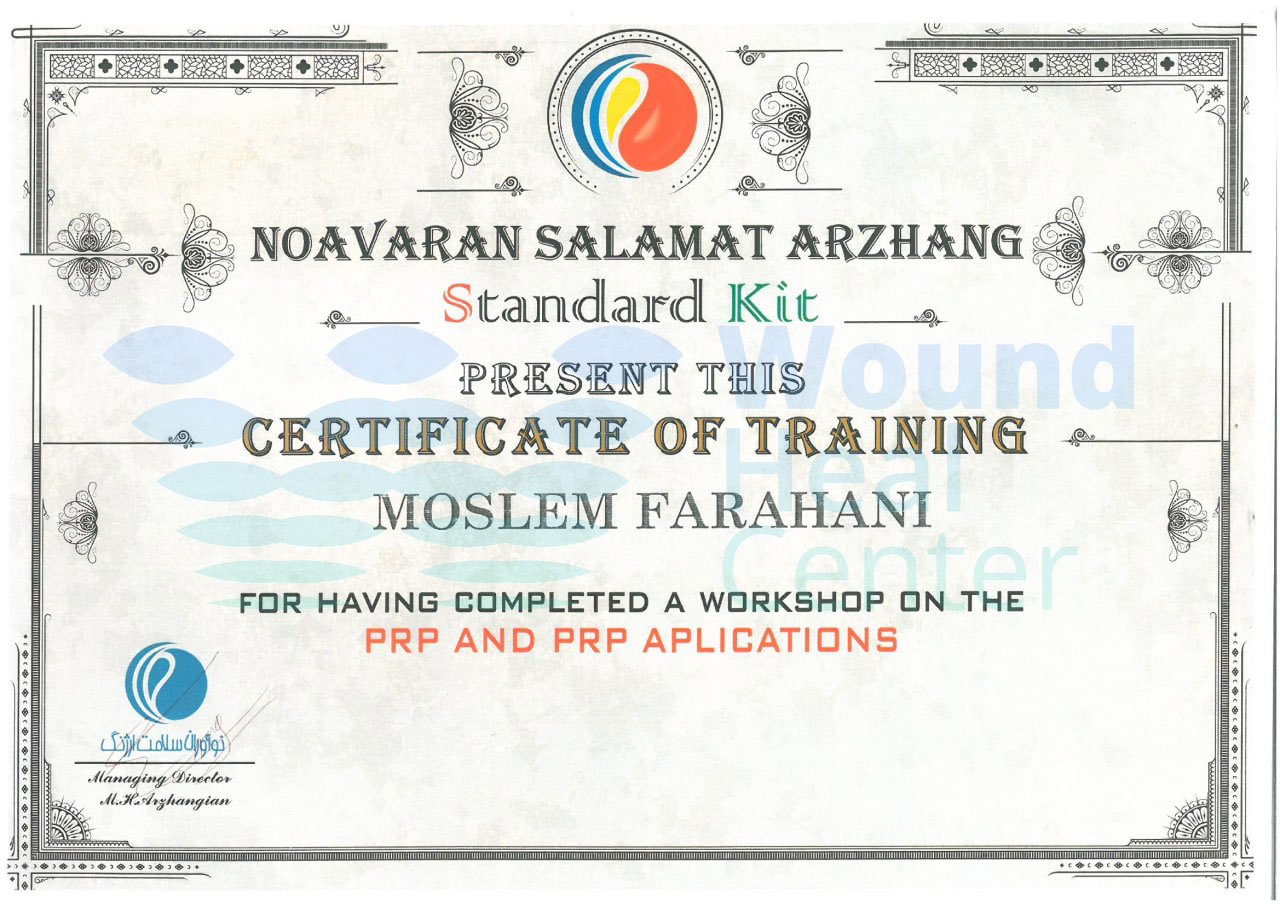 - سرتیفیکیت دوره تخصصی پی آر پی زیبایی و زخم شرکت نوآوران سلامت ارژنگ
